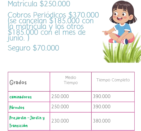 - Pago del seguro obligatorio contra accidentes, el cual se debe consignar al número de Nequi 322 5230148 cc 70111852 a nombre de Oscar Mazo Ortìz soporte debe ser entregado el día de la matrícula en el preescolar en físico.($70.000)